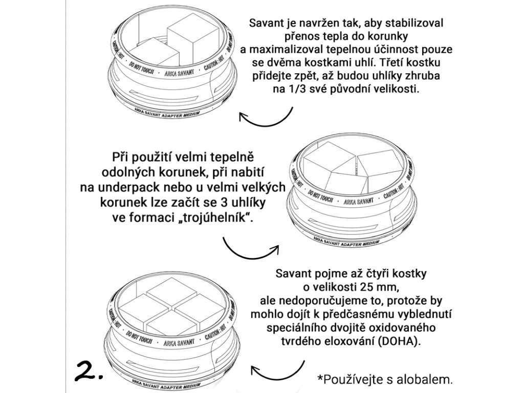 Poznámka: Pro tento typ HMS nejsou vhodné rychlozápalné uhlíky, neboť nevyzařují potřebné množství tepla, aby HMS dostatečně zahřály.