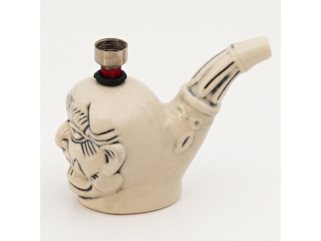 Menší bong vyrobený z keramiky s vypodobněním hlavy Lucifera se zákeřným úsměvem, s turbem