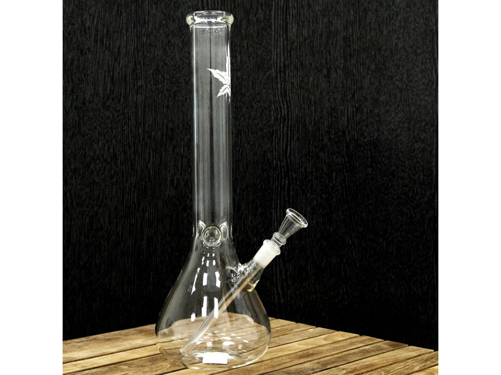 Čirý bong střední velikosti z odolného tvrzeného skla Simax zdobený motivem jednoho konopného listu.
