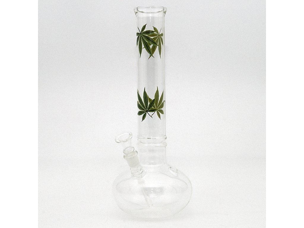 Velký čirý bong z odolného tvrzeného skla simax na náustku zdobený motivem konopných lístků
