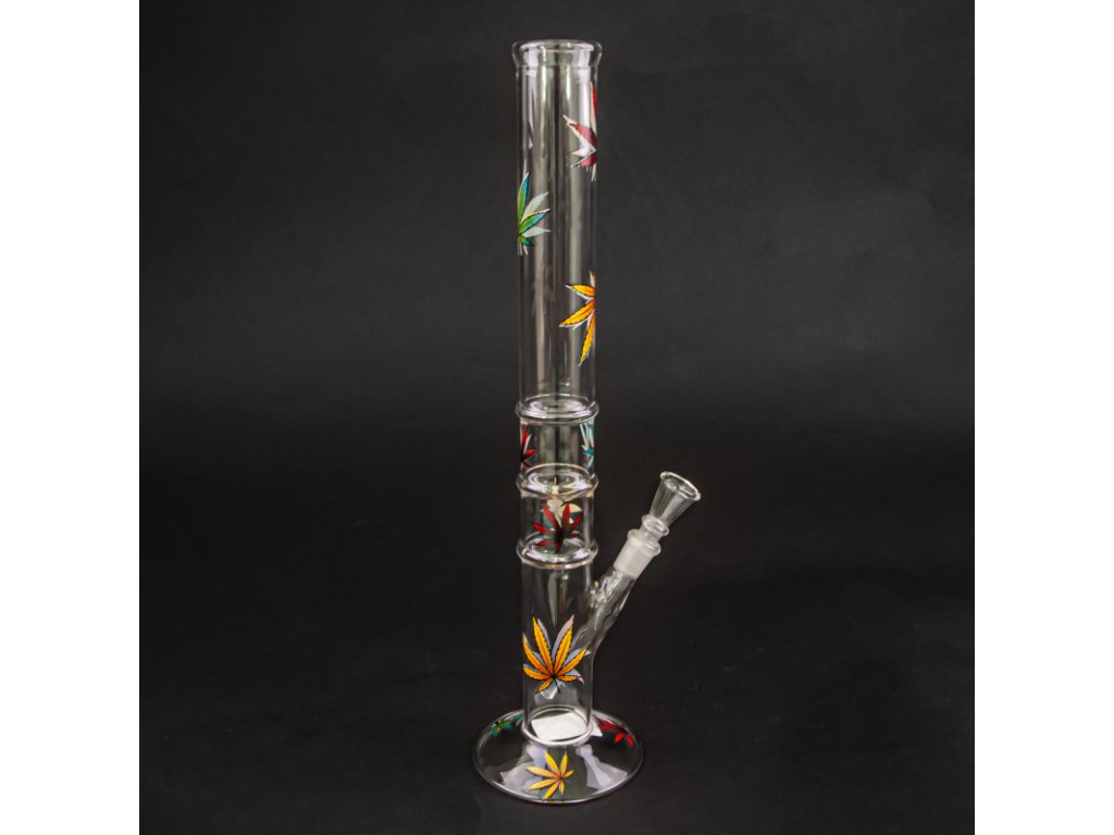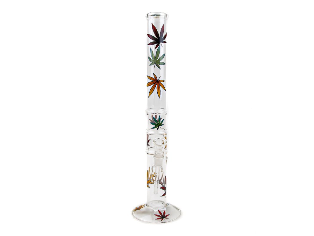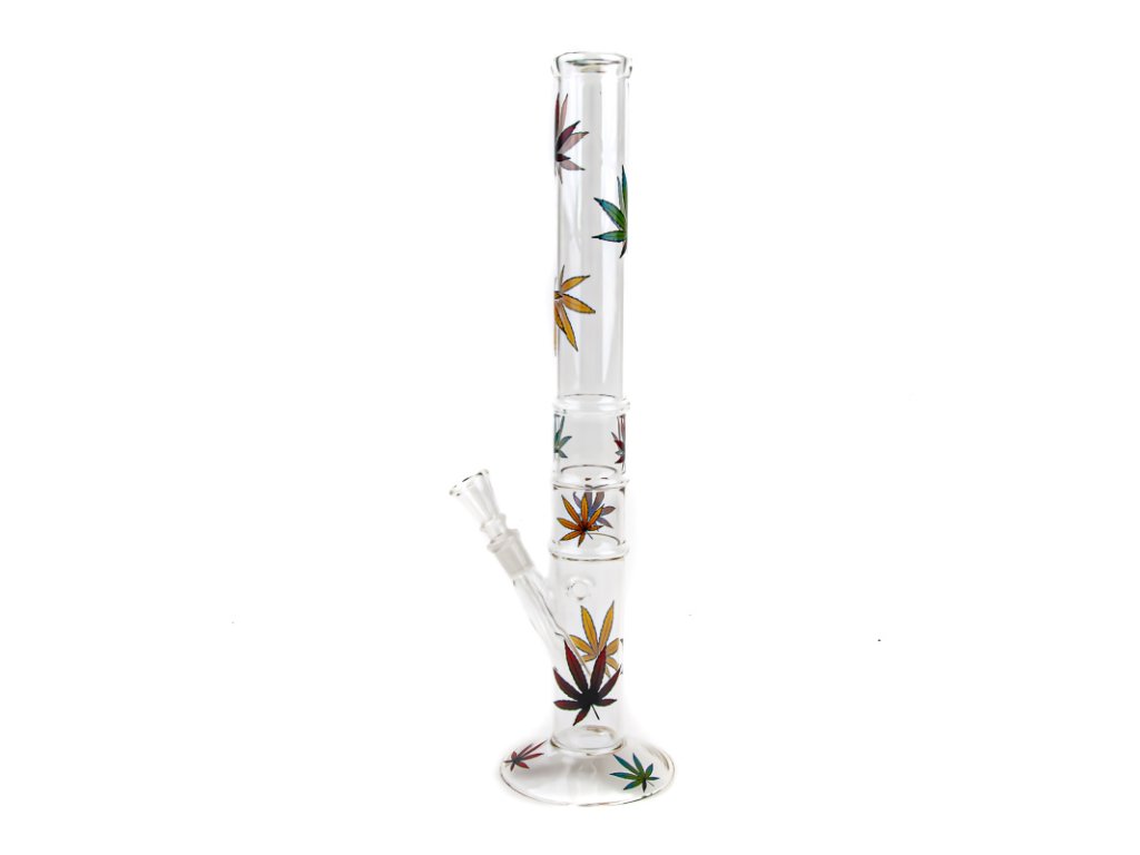 Čirý bong střední velikosti z odolného tvrzeného skla Simax zdobený motivem konopných listů.