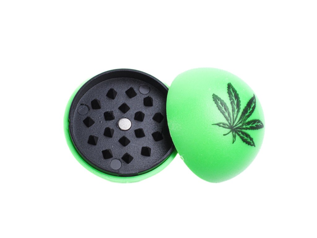 Plastová drtička ve tvaru míčku s velmi ostrými hroty a magnetickým zámkem. Drtička je zdobená motivem konopného lístku.