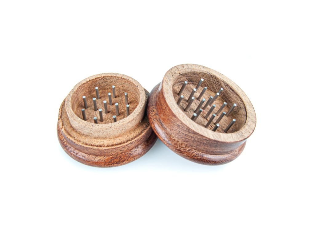 Stylová dřevěná drtička s vloženými kovovými vrty.