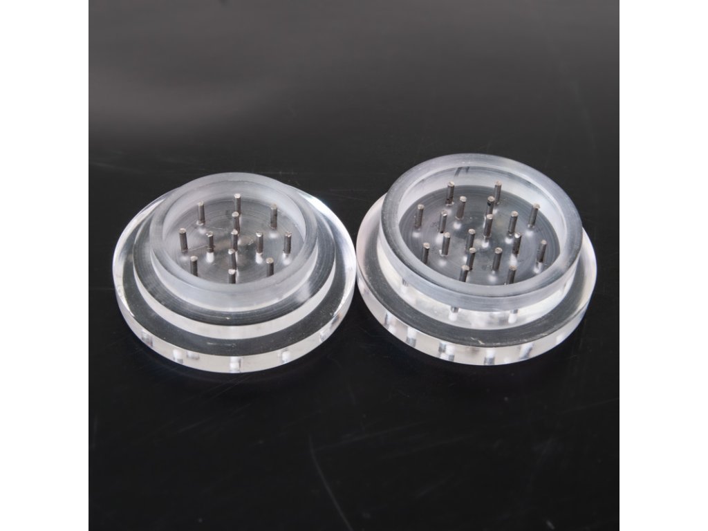 Dvoudílná drtička z průsvitného plastu s vloženými kovovými hroty.