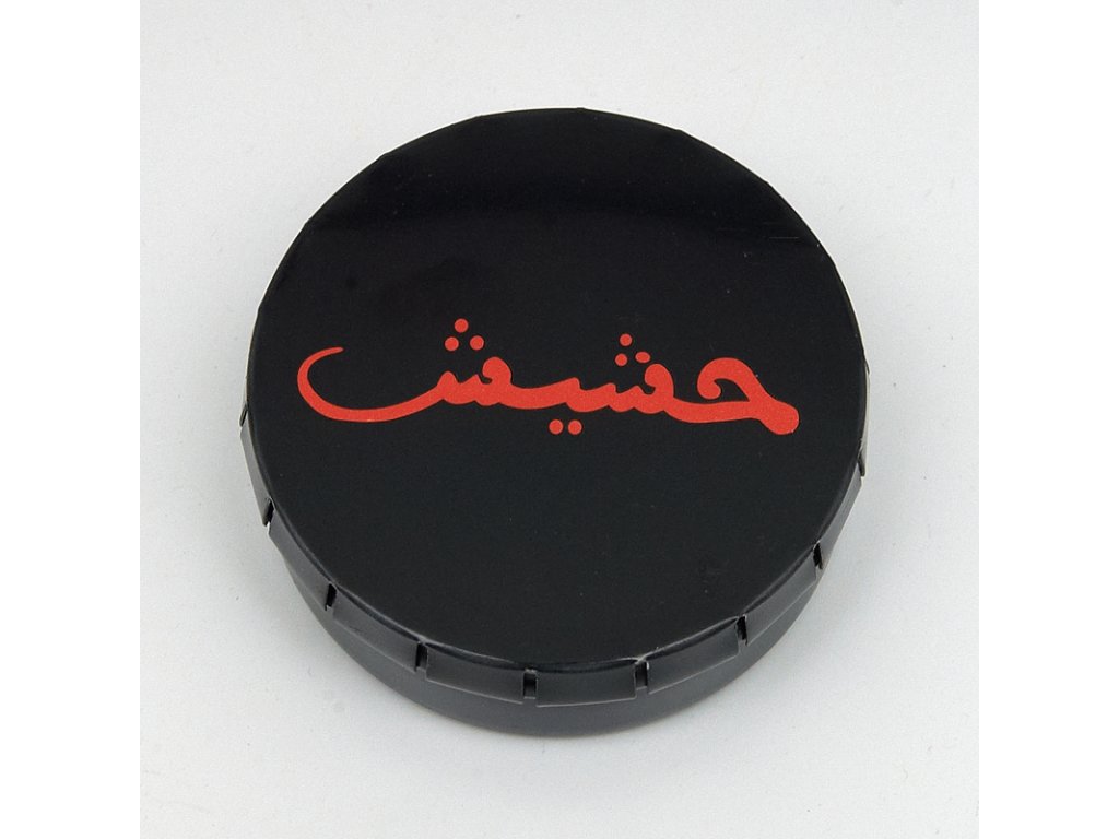 Hliníkový zásobník s uzávěrem klik klak v černé barvě, s nápisem Hashish, typ headcase Hashish arabiaDodatočné parametre