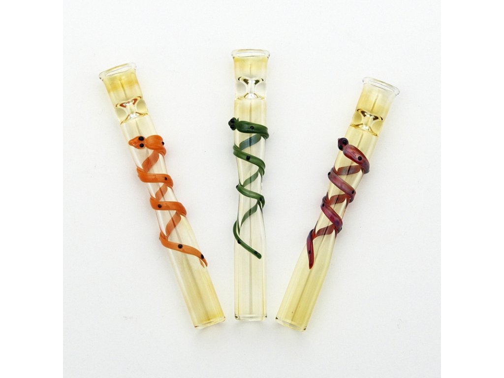 Větší skleněnka z borosilikátového skla s rozšířeným kotlíkem a zúženým náustkem. Na skleněnce je u kotlíku zdobení ve tvaru malého barevného hada.