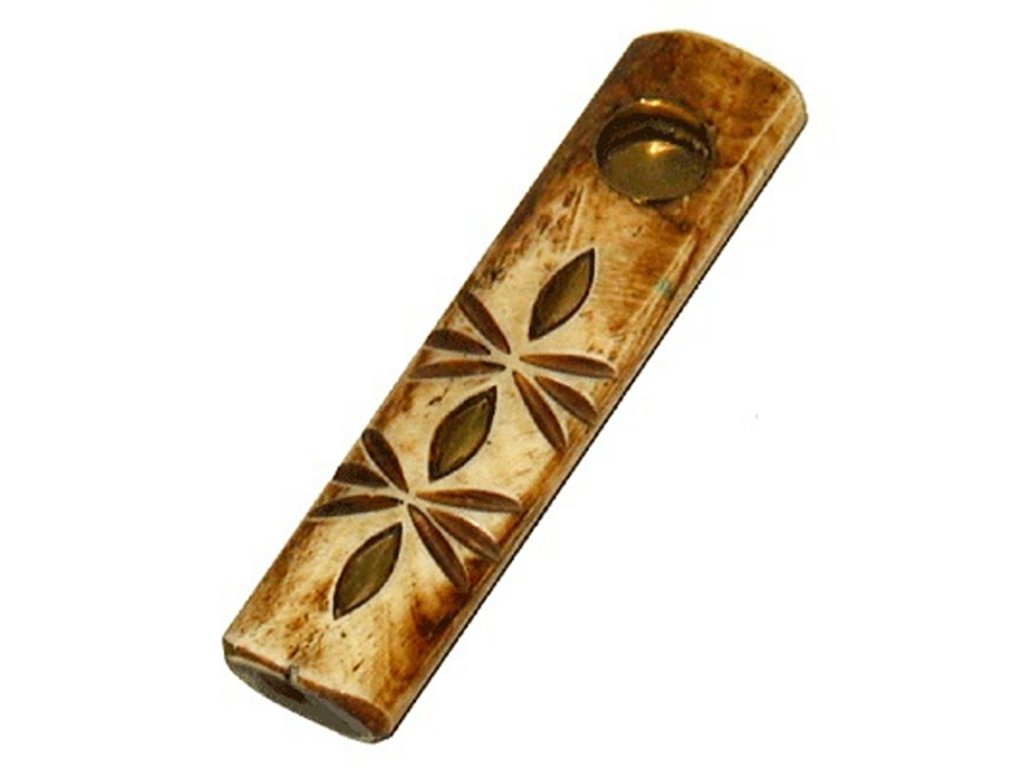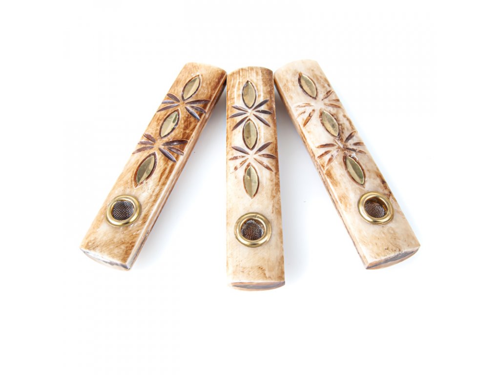 Výborná dlouhá šlukovka vyrobená z kosti. Dýmka má na kotlíku kovovou ochranu a je na horní straně zdobená řezbou.