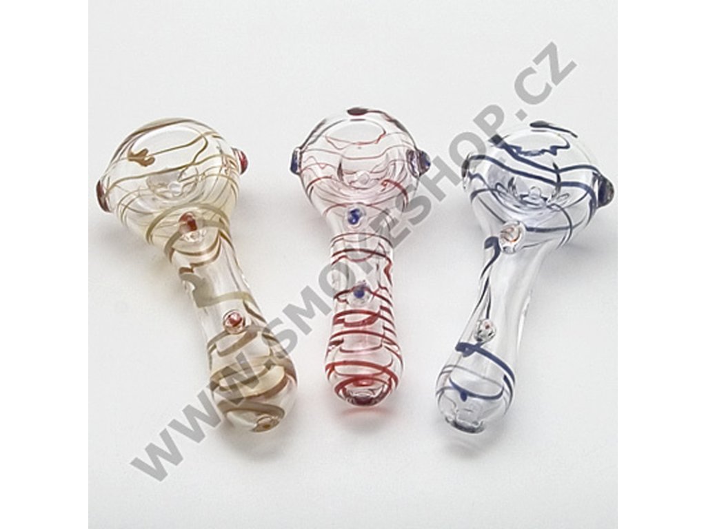 Perfektní čirá šlukovka z odolného borosilikátového skla pyrex s bočním turbem. Dýmka je celá zdobená barevnými proužky a malými kuličkami.