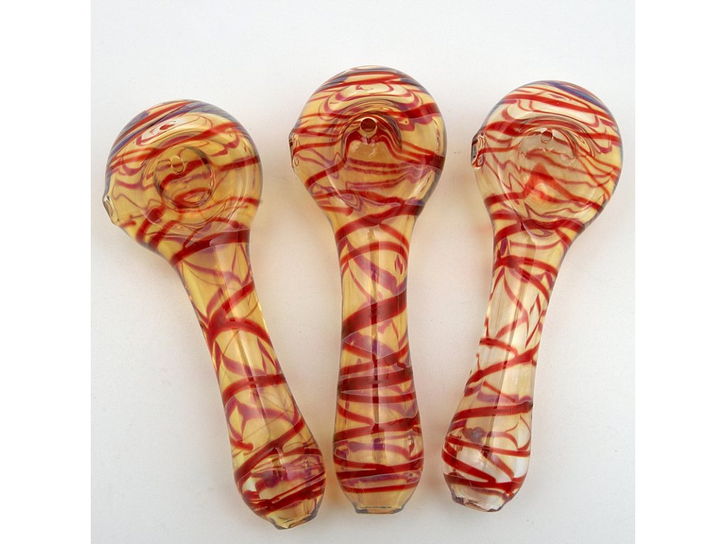 Perfektní menší šlukovka z odolného borosilikátového skla pyrex s bočním turbem. Dýmka je celá zdobená červenými proužky.