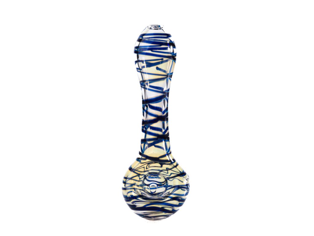 Perfektní menší šlukovka z odolného borosilikátového skla pyrex s bočním turbem. Dýmka je celá zdobená modrými proužky.