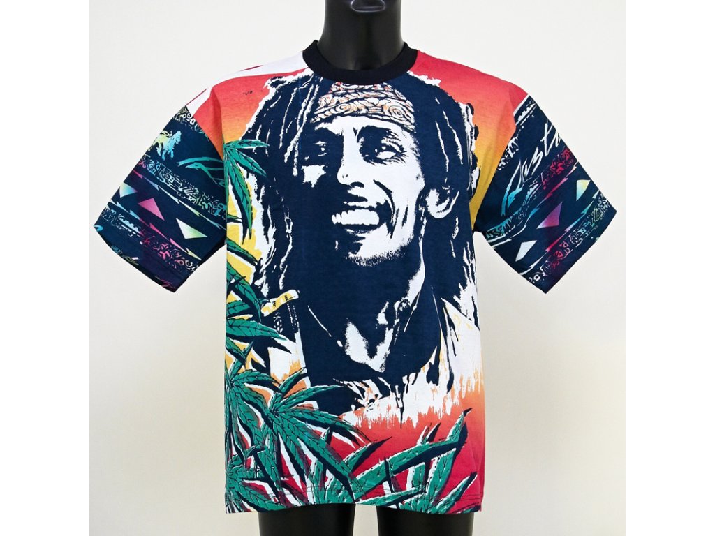 Bavlněné tričko Rasta Factory s moderně graficky ztvárněnou hlavou Boba Marleye, zelenými listy a ethno motivy.