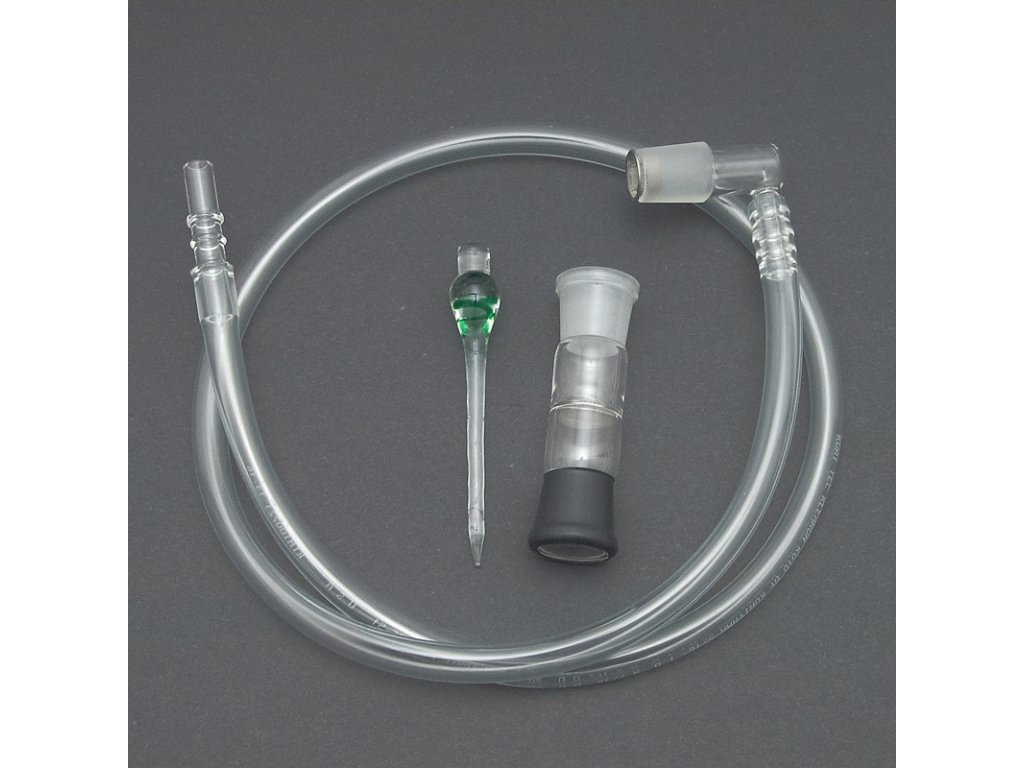 Vaporizer Arizer Hadice KIT - kompletní náhradní hadice z odolného materiálu - netoxického PVC, s připojeným skleněným adaptérem (sítko uvnitř adaptéru) a skleněným náustkem je doplněna o další, pro vaporizování potřebné, náhradní díly - skleněnou korunku Cyclone, která je určena k vaporizaci bylin a skleněné hrabátko pro manipulaci s bylinami během kouření. Skleněné části jsou vyrobeny z odolného žáruvzdorného borosilikátového skla. Přibližná délka samotné hadice je 90 cm.